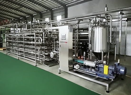 套管殺菌系統主體分為冷熱物料熱回收段、預熱段、殺菌持溫段、冷卻段。整個殺菌過程全自動控制,人機界面可靈活設定殺菌溫度。生產過程中殺菌溫度上下溫差波動不超過0.5℃.配帶壓力多功能罐,生產的時候用來緩沖物料和物料回流,生產結束后可用做CIP清洗罐。本設備采用高端配置,操作簡單方便,設置好殺菌參數,一鍵式操作。自動完成殺菌過程,不需要人為干預。殺菌機采用冷熱物料直接熱交換實現升溫和降溫,比同行業相同殺菌機節能30%。殺菌機自帶CIP清洗系統。